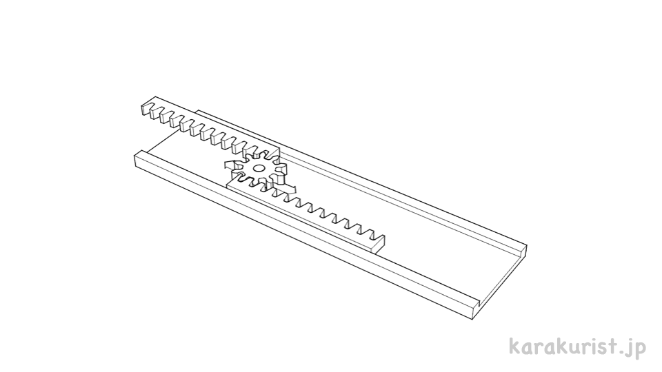 このピニオンがそのまま左右に動くと2つのラックもそれに応じて左右に移動します。